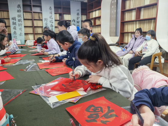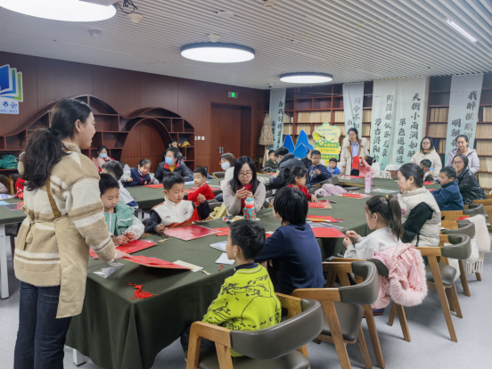 最令人期待的亲子 DIY 写福字环节将活动推向高潮。在美术菠萝老师的指导下,孩子们一笔一划地在红纸上描写 “福” 字。有的笔法稚嫩却饱含童真,有的工整规范尽显认真,大家相互展示成果,分享书写乐趣,一张张红彤彤的 “福” 字不仅承载着对新春的美好期盼,更定格了亲子互动的温馨瞬间。