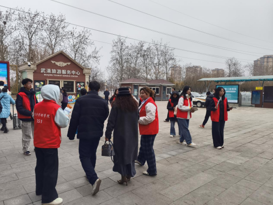 活动中,志愿者们身着志愿马甲,面带亲切的微笑,穿梭于熙熙攘攘的客流之中。他们主动向过往游客分发《京津明珠・幸福武清文明旅游倡议书》《中国公民国内旅游文明行为公约》等宣传资料,耐心细致地讲解文明旅游的意义,热情周到地为游客答疑解惑,尽己所能为旅客排忧解难。志愿者们积极倡导大家在出行途中爱护生态环境、恪守公共秩序、自觉摒弃不文明陋习,以一言一行争做文明旅游的践行者与传播者。